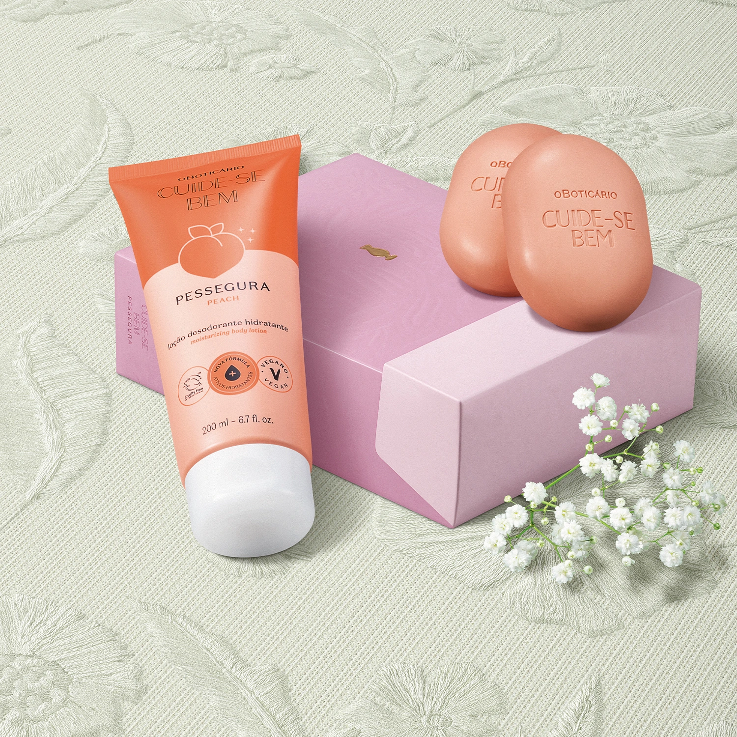 A Loção Hidratante Desodorante Corporal Cuide-se Bem Pessegura hidrata e perfuma todo o corpo para uma pele de pêssego. Tem uma textura leve que absorve rapidinho deixando a pele sedosa com toque aveludado.