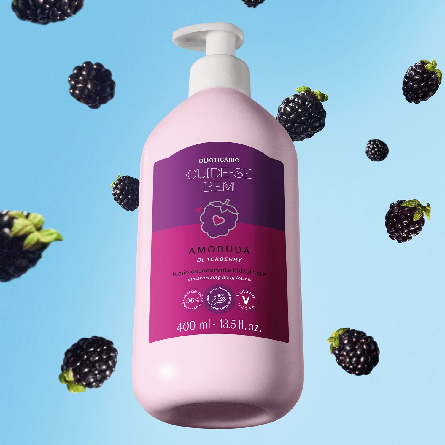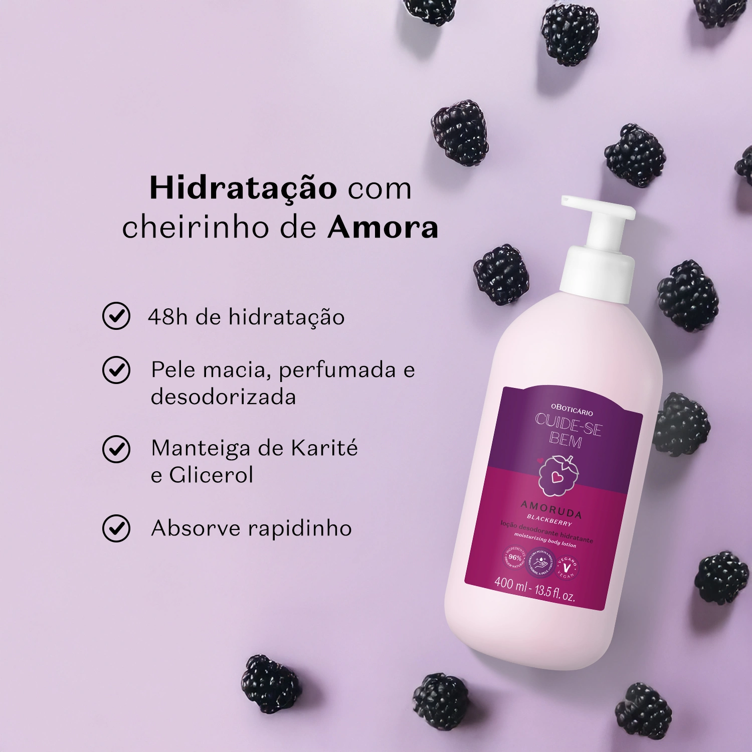Com o cuidado e a fragrância da amora, a Loção Hidratante Desodorante Corporal Cuide-se Bem Amoruda tem textura cremosa e possui extrato da fruta, além de formar uma película protetora sobre a pele, para você viver com toda a abundância que merece e, de quebra, ficar cheirosa e hidratada.